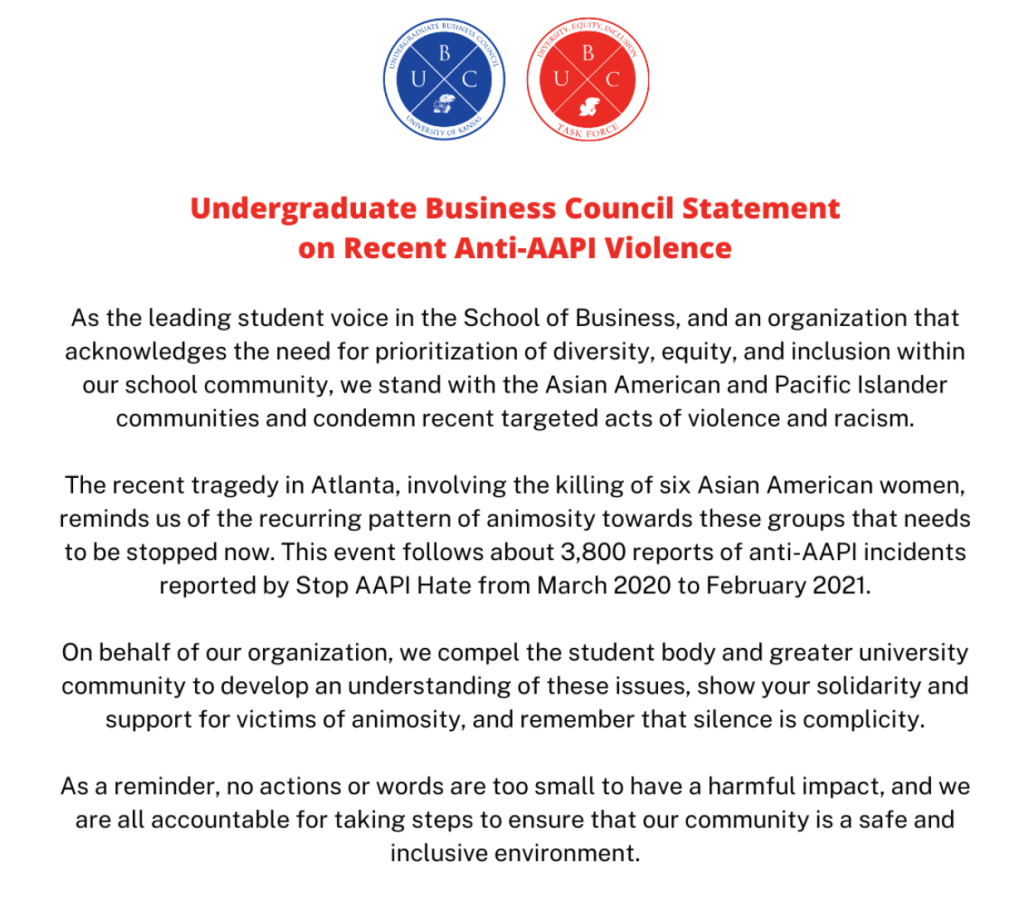 • Co-authored a professional statement on behalf of the Undergraduate Business Council regarding acts of violence that occurred against Asian American and Pacific Islander communities during the time I was a leader on the committee