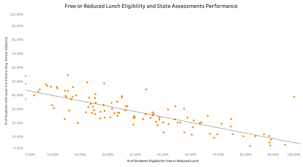 Likewise, there is a high negative correlation between the percentage of students who are eligible for free or reduced lunch in a high school and the percentage of students at that school who score at a level 3 or 4 on state assessments. For the same schools and year, this correlation was approximately -0.8.